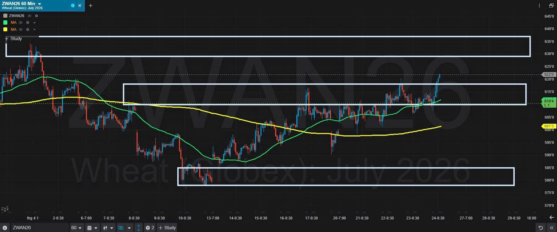 Trên khung H1, giá lúa mì bật tăng sau khi kiểm định thành công vùng hỗ trợ 610 – 618, giá hiện đã vượt lên trên đường MA50 và giữ trên đường MA200 hướng lên cho thấy xu hướng tăng đang chiếm ưu thế. Trong kịch bản tích cực nếu giá giữ vững trên đường MA50 giá có thể tiến đến kiểm định vùng kháng cự 629 – 637.